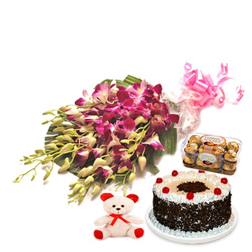 Effective ComboYou will love this idea! It's a great, cost-effective combo to have an amazing decorated cake lipsmacking, delicious creamy chocolaty filling inside with crispy wafer chocolates, soft touch warm teddy bear with long lasting, twin purple color Orchid is stunningly presented to let that someone special in your life know they are on your mind. Combo consists bouquet of 6 purple orchids with seasonal foliage in cellophane Packing & matching ribbon. 200 gms Ferrero Rocher Chocolate Box & approx 8 inch height Soft Teddy Bear along with yummy Black Forest Cake |