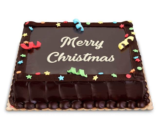 MERRY CHRISTMAS CAKEA delightful combination of chocolate cookie crumb crust, light caramel mousse filling w/ suspended cookie pieces topped w/ whipped cream frosting, chocolate cookies & chocolate syrup. |