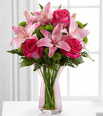 Special #9Pink flared vase is a great choice for Mom. Hot pink roses, pink lilies, and green button mums are sure to make anyone smile. |