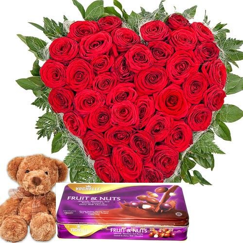Queen of Hearts36 red roses in a heart basket with 8 inches teddy and a vochelle chocolate box |