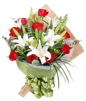 Red roses 9 stems, white lilies 3 stems, match green. English news paper and with gauze packed, finished with bowknot.