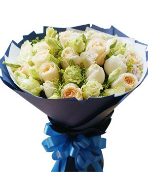 I Miss You19 champagne rose bouquet for love, with solidago, eustoma grandiflorum(decorated flower may replace to white rose for some areas). White paper inside, blue paper outside round style bouquet. |