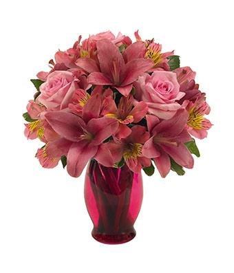 MAJESTIC PINKSGorgeous pink floral bouquet including roses and lilies. The vase is not included. |