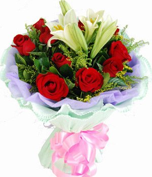 11 premium red roses, 1 stalk easter lily and match foliages and small flowers. Lilac colour cotton paper and green crepe paper round packed. Please note may substitute easter lily for white lily depending upon availability in certain regions.