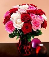 A bright gift for your loved one to say how close he/ she is to your heart. 12 red, 12 pink and 12 white roses in a vase.